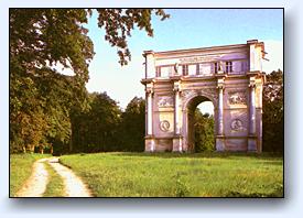 Od konce 18. století se původní park kolem zámku rozšiřoval do okolí a vznikají první drobné stavby (roku 1794 – Chrám slunce, roku 1975 – Čínský pavilon, roku 1798 – Obelisk na památku míru uzavřeného mezi Francií a Rakouskem a v letech 1798 – 1802 – Minaret, buduje se chrám Múz, Holandská rybárna s přístavem a divadlo). Dnes můžeme obdivovat pouze Minaret a Obelisk.