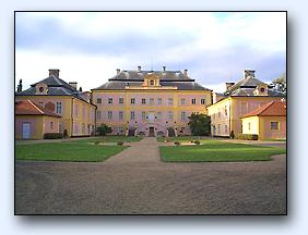 Nejstarší dochované zmínky o Krásném Dvoře pocházejí ze 14. století. Postupně se na tomto panství vystřídala celá řada feudálů (Fremutové, Kolovratové, Šimon Karel Oudrcký, Václav Michna z Vacínova). Největší měrou se však do historie Krásného Dvora zapsal šlechtický rod Černínů, který (Heřman Černín z Chudenic) zakoupil panství v Krásném Dvoře v polovině 17. století. Z nich se pak František Josef Černín rozhodl k rozsáhlé přestavbě renesanční vily (postaven na místě původní tvrz koncem 16. století Janem ml. Maštovským z Kolovrat). Projekt přestavby vypracoval známý český architekt František Maxmilián Kaňka. Práce byly zahájeny v lednu roku 1720 a ukončeny v roce 1724. Z archivních materiálů vyplívá, že původní projekt přestavby byl na žádost F. J. Černína zhruba v polovině prací radikálně změněn. Koncem 18. století byly provedeny některé úpravy budov zámku (v roce 1783 zřízena kaple, v letech 1791-92 byla postavena dvouramenná schodiště v nádvoří a na severní zahradě a současně zazděny přízemní arkády). Objekt zámku Krásný Dvůr nese výrazný vliv francouzského stavitelství. Stavba je přirozeným a citlivým způsobem začleněna do okolní krajiny a je jejlí dominantou. V současné době je v zámku zpřístupněno pro veřejnost 18 místností a chodbová galerie. Původně renesanční tvrz, kterou nechal v letech 1720 - 1724 tehdejší majitel František Josef Černín přestavět na barokní zámek. Autorem projektu je pražský architekt F. M. Kaňka. Zámek má trojkřídlou dispozici, je jednopatrový s dvoupatrovým hlavním traktem a hlubokým čestným dvorem obklopeným přízemními křídly hospodářských budov. V letech 1788 - 1793 založil Jan Rudolf Černín u zámku rozsáhlý anglický park, první svého druhu v Čechách. Volné travnaté plochy parku oživuje množství romantických staveb, které leckde ukončují jako dominanty různé průhledy. Přírodně krajinářský park v Krásném Dovře, jehož rozloha činí 100 ha, byl založen v letech 1783 - 1793 Janem Černínem z Chudenic. Tuto skutečnost ovlivnily jednak jeho botanické záliby a potom také cesta po západní Evropě, kterou podnikl v roce 1779. V té době se do Evropy začal šířit z Anglie nový sadovnický směr, podle kterého měla být přirozená krajina přivedena až k nejbližšímu okolí budov. Právě na podmínce přirozené, lidskou rukou uměle nemodelované krajiny je založena podstata přírodně krajinářského parku. Zámecký park v Krásném Dvoře je toho pádným důkazem. Podle tehdejší módy byl oživen řadou romantických staveb, které zkrášlují volné plochy nebo ukončují různé průhledy parkových partií. Z hlediska dendrologického najdeme v parku přes 100 druhů dřevin, a to výhradně původní domácí nebo zdomácnělé druhy. Roste zde řada prastarých dubů, buků, lip, jírovců, platanů, javorů a olší. Nejvýznamnější je tzv. Goethův dub (dnes již torzo), jehož věk se odhaduje na 1000 let a patří tudíž mezi nejstarší stromy v Čechách. Za zmínku stojí také tzv. francouzská zahrada, umístěná za východní částí zámku. Parter je ře ... |
